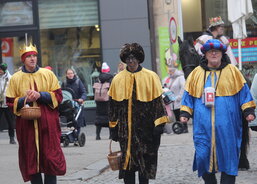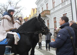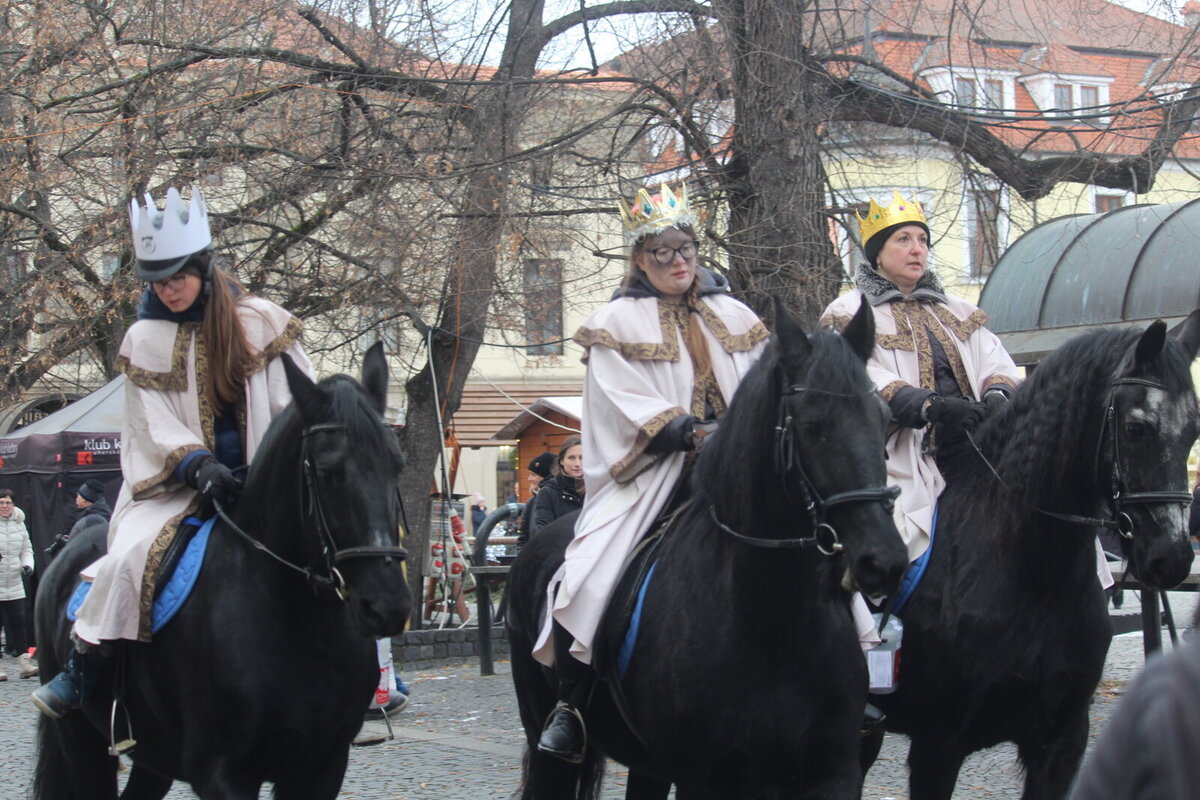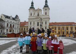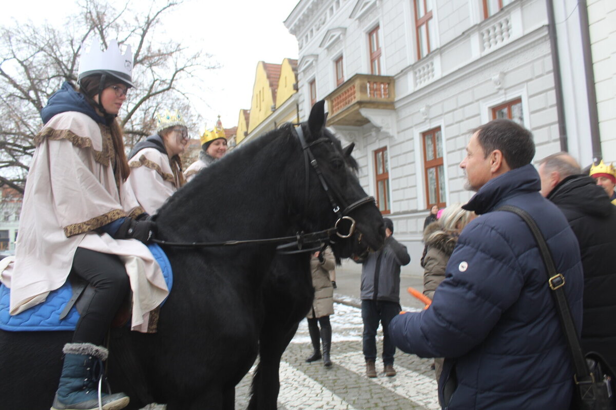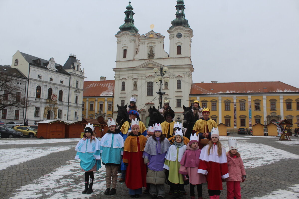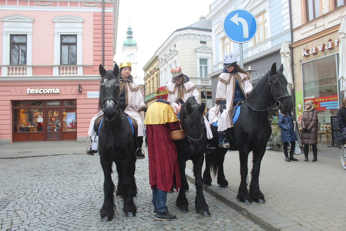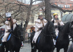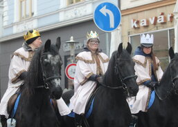 Královské procesí na koních i s doprovodem kráčelo v pondělí po poledni centrem Uherského Hradiště a s tradičním popěvkem vzkazovalo novoroční přání kolemjdoucím a do zapečetěných pokladniček přijímalo peněžní dary pro Tříkrálovou sbírku.