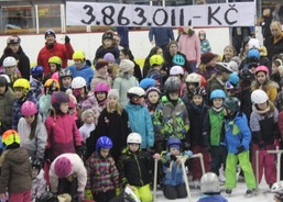 Na obřím transparentu uprostřed ledové plochy představili organizátoři částku, kterou koledníkům na Hradišťsku letos lidé věnovali do pokladniček.